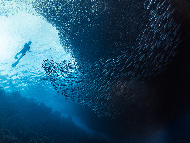 Snorkeling with a massive school of sardines in a shallow coral reef. Moalboal, Cebu, Philippines. The Fund for Responding to Loss and Damage will not only help people in the aftermath of a disaster intensified by the climate crisis but also support the recovery of vital ecosystems such as coral reefs. Image credit: SaltedLife / Shutterstock
