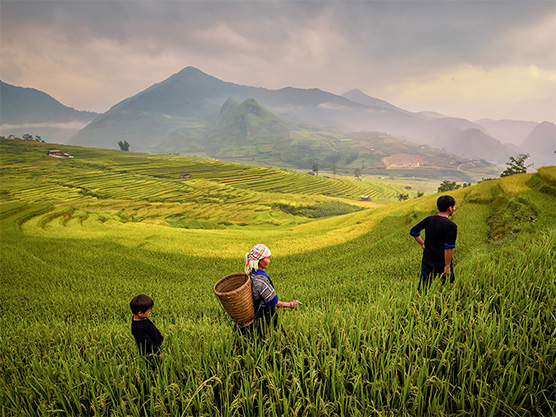 A family walks in a rice paddy. The Fund for Responding to Loss and Damage will play an important role in transforming people's lives after a climate intensified disasters. Allowing them to get back on their feet quickly and build back better so that when the next storm, flood or drought comes, they are protected. Image credit Suriya99 / Shutterstock